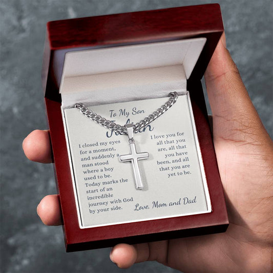 Graduation Gift for Son or Grandson, I'm Proud of You, Faith Cross Necklace on Cuban Chain