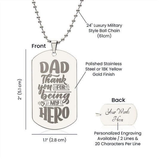 Thank You For Being My Hero, To Dad Gift Engraved Dog Tag Necklace For Father's Day