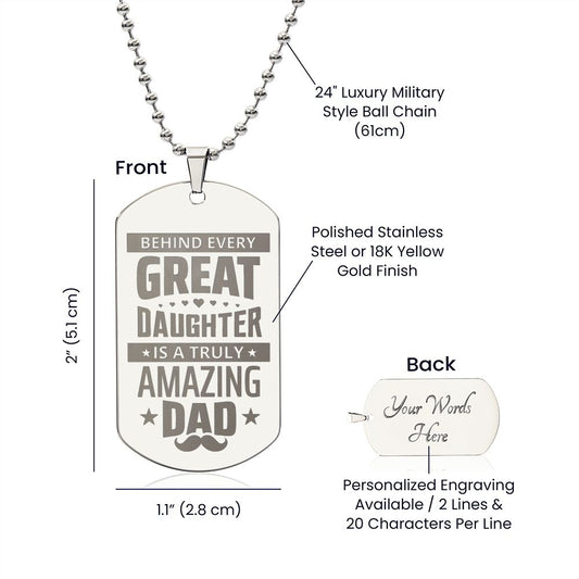 Behind Every Great Daughter is a Truly Amazing Dad, To Dad Gift Engraved Dog Tag Necklace For Father's Day