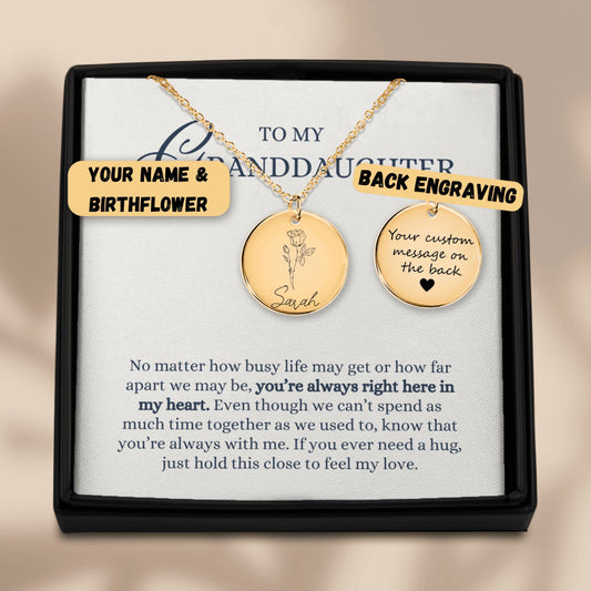 To my Granddaughter, Hold This Close to Feel My Love, Laser Engraved Personalized Birth Flower Pendant Name Necklace