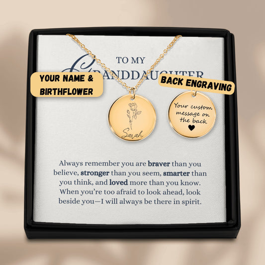 To my Granddaughter Gift, Remember You are Braver, Laser Engraved Personalized Birth Flower Pendant Name Necklace