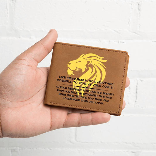 To Son Gift or Grandson Gift, Inspirational Graphic Leather Wallet, Lion Head Live Fearlessly