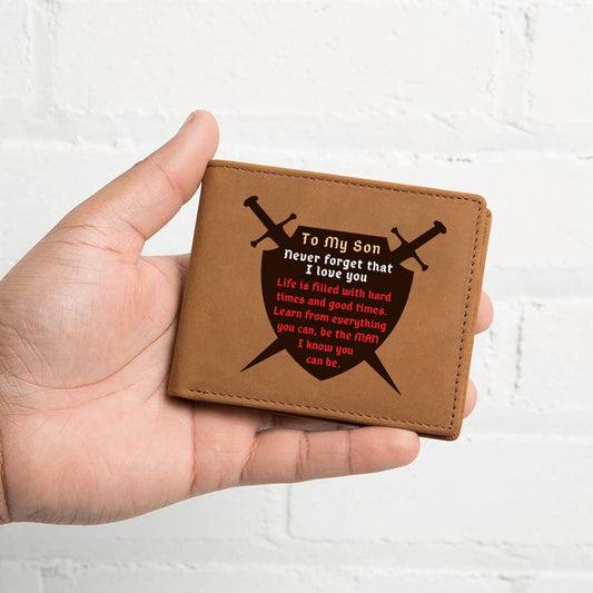 To Son Gift, Warrior Shield, Hard Times and Good Times, Inspirational Graphic Leather Wallet