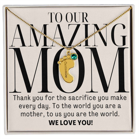 To Our Amazing Mom, Thank You For Your Sacrifice, Custom Engraved Baby Feet with Birthstones Name Necklace