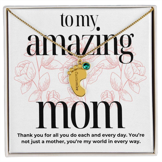 To My Amazing Mom, Thank You For All You Do, Custom Engraved Baby Feet with Birthstones Name Necklace