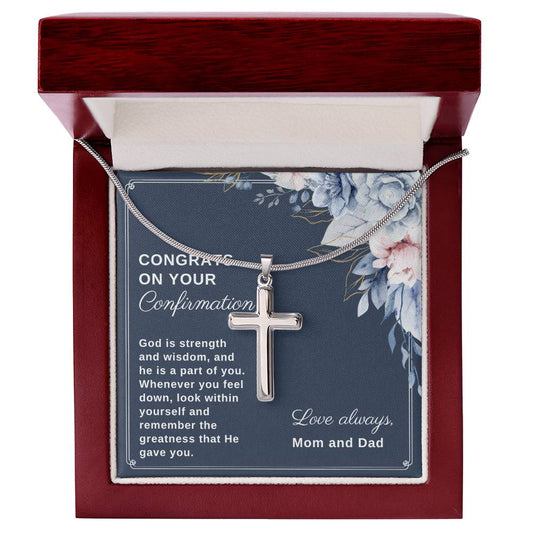 Confirmation Gift For Daughter From Mom and Dad, God is Strength and Wisdom Stainless Steel Cross Necklace