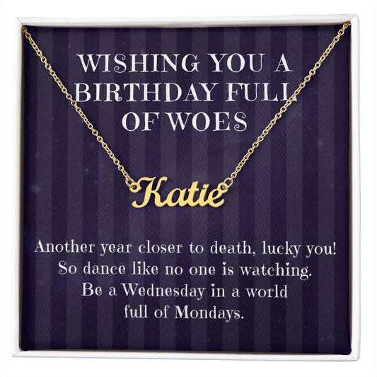 Birthday Full of Woes, Another Year Closer to Death, Custom Name Necklace Gift