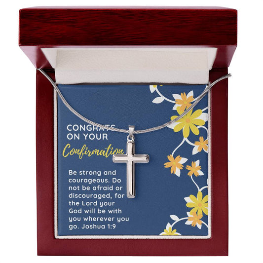 Confirmation Gift for Her, May Be Strong and Courageous Stainless Steel Cross Necklace